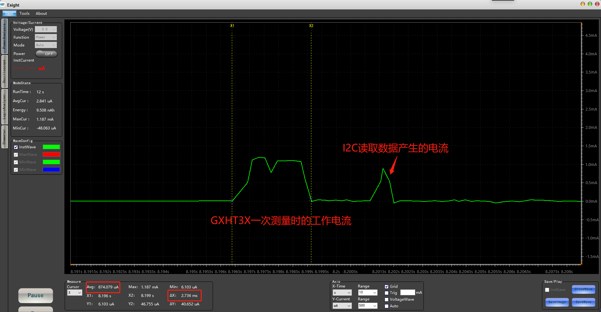 2.继续分析这个电流波形,我们展开一个电流峰,这也是GXHT3X测量时的工作电流。我们从电流波形中可以看到实测的工作电流是874.079uA,规格书中的典型值是600uA。而且波形中一次测量的持续时间是2.736ms,与规格书中的典型值2.5ms也是比较接近的。